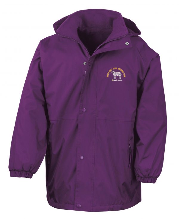 Reversible, zip away waterproof adjustable hood. Strong waterproof PVC coated polyester on one shell.