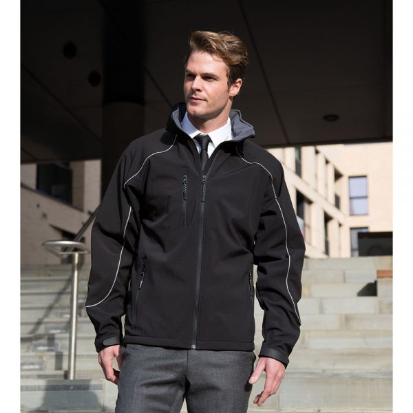 Water resistant seamless shoulders. Windproof. Result 3 layer softshell technology. Breathable. Fully waterproof hood. Soft 2-way stretch fabric. Comfortable active cut. Concealed fully lined hood with tear release closing chin guard, wired visor and shockcord adjusters. YKK full front zip fastening. 2 mesh lined zip closing side pockets for extra venting, 1 mesh lined zip closing chest pocket for extra venting, 2 large inside pockets and 1 inside phone pocket. Easy open zip pullers. Adjustable shockcord hem. Tear release adjustable cuffs. Inner storm flap. 3M reflective safety piping to shoulders and sleeves. Zip opening underarm vents with mesh cover. Concealed access for print and embroidery. Waterproof fabric.